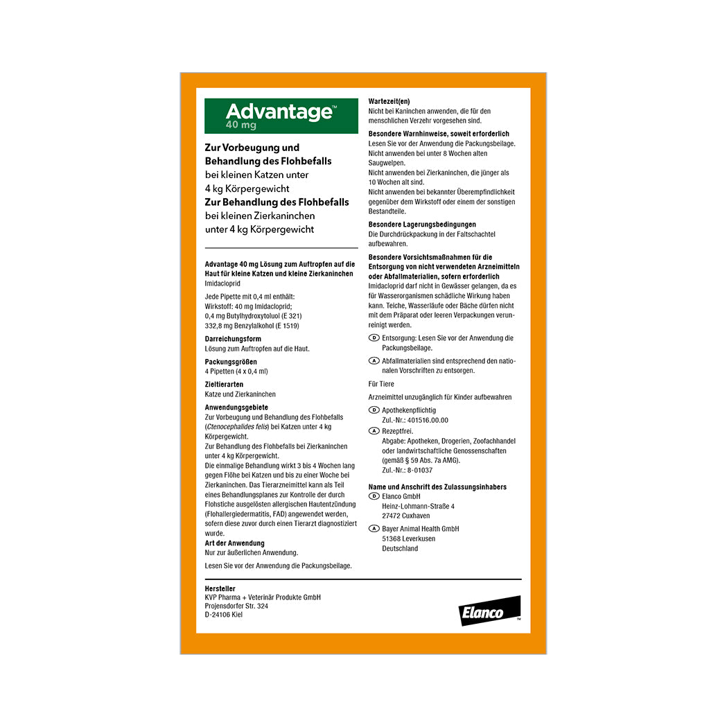 Advantage für Katzen und Zierkaninchen sind einfach anzuwendende Spot-On-Pipetten zur Vorbeugung und Behandlung von Flohbefall. Geeignet ab der 8. Lebenswoche bei Katzen und ab der 10. Lebenswoche bei Kaninchen, bieten sie eine stressfreie Möglichkeit zum Schutz Ihres Haustiers.